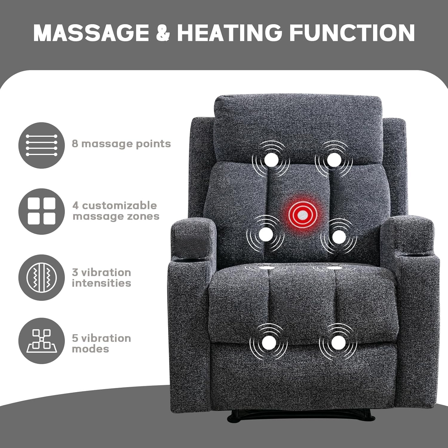 CANMOV Manual Recliner Chair with Massage and Heat,Soft Fabric Recliner Chair with Overstuffed Arm and Back, Manual Reclining Single Sofa with 2 Cup Holders, Side Pocket for Living Room,Dark Grey