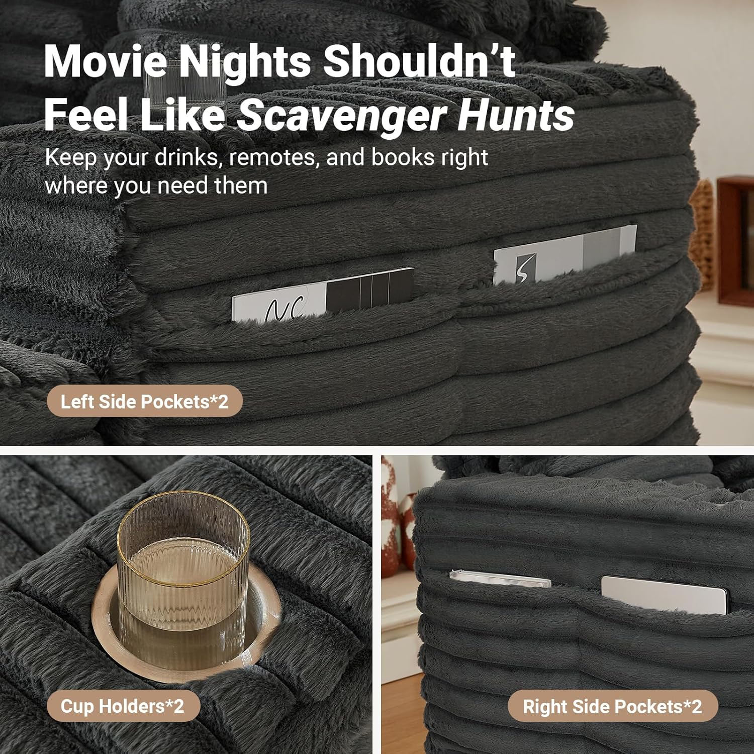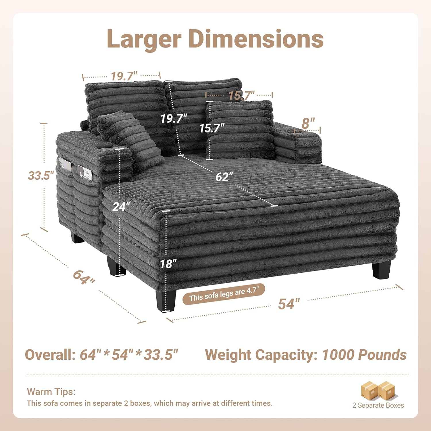Chaise Lounge Chair Indoor, 64" Oversized Sleeper Chair with Wood Frame, Upholstered Sofa Bed for Living Room, Movie Room, Bedroom with 4 Storage Pockets&2 Cup Holders(Plush Corduroy, Grey)